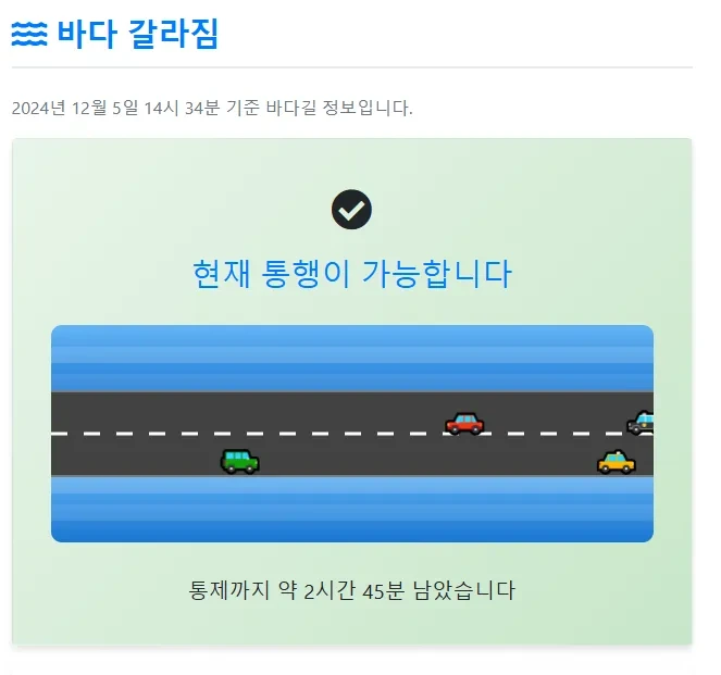 - 기상 상태에 따라 바닷길이 열리는 시간이 변동될 수 있습니다. 예를 들어, 바람이 강하거나 파도가 높을 경우 통행시간이 지연될 수 있습니다. 따라서, 방문 전 기상 예보를 확인하는 것이 좋습니다.