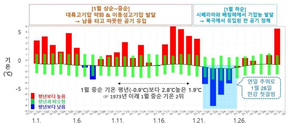 - 한파의 영향: 북극에서 발생한 한파가 우리나라로 유입되면서 기온이 영하로 떨어지는 현상이 나타나고 있습니다. 특히 경기북부와 강원 지역은 영하 15도 이하로 떨어질 것으로 예상됩니다.